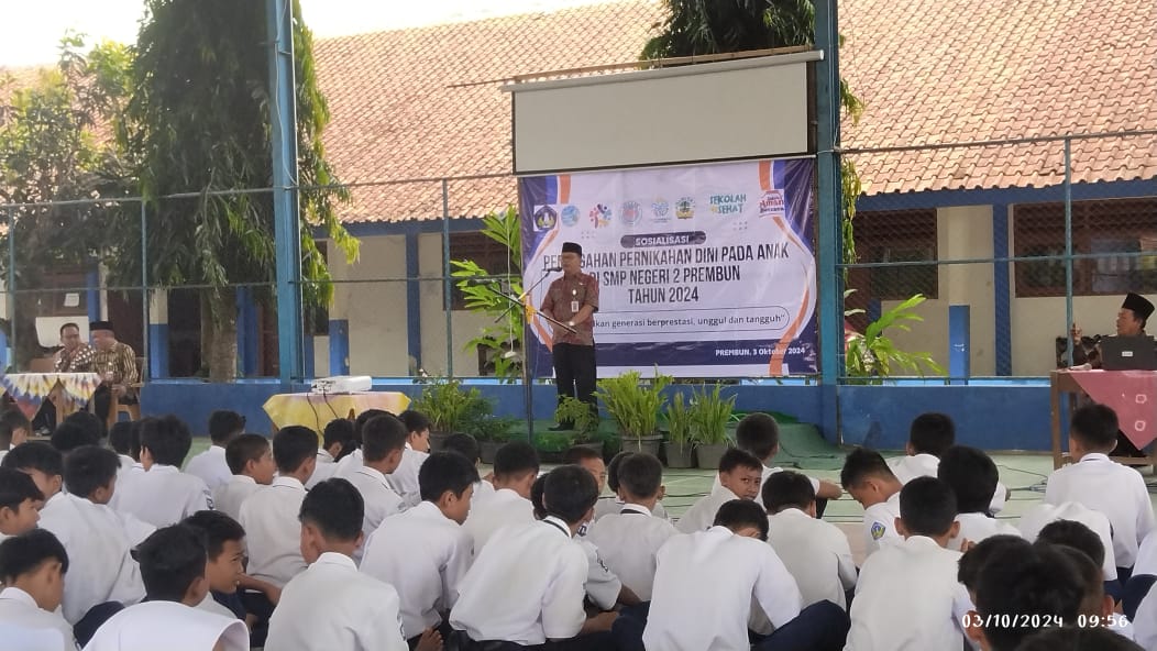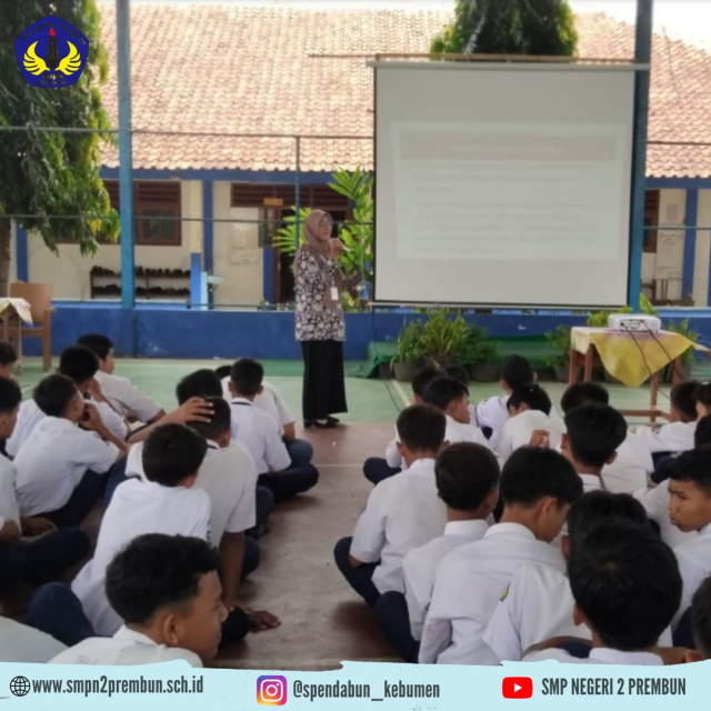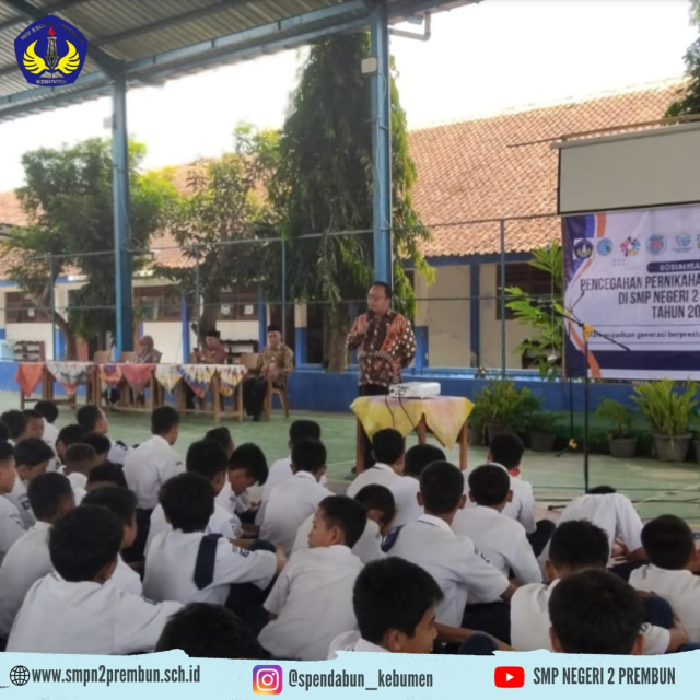 Kegiatan pencegahan pernikah dini pada anak di SMP NEGERI 2 PREMBUN dilaksanakan pada 03 Oktober 2024. Kegiatan ini dilaksanakan di GOR SMP NEGERI 2 PREMBUN dan diikuti oleh seluruh siswa-siswi SMP NEGERI 2 PREMBUN. Kegiatan ini bertujuan untuk mencegah pernikahan dini pada siswa-siswi SMP NEGERI 2 PREMBUN. Kegiatan ini disampaikan oleh pihak Puskesmas Prembun dan BKKBN Kebumen. Adapun susunan acaranya dimulai dengan menyayikan lagu Indonesia Raya, dilanjutkan sambutan dari kepala sekolah SMP NEGERI 2 PREMBUN, penampilan-penampilan dari siswa-siswi, edukasi dari BKKBN Kebumen tentang akibat pernikahan dini pada anak, dilanjutkan edukasi dari Puskesmas Prembun. Siswa-siswi mengikuti acara tersebut dengan tenang dan antusias.
