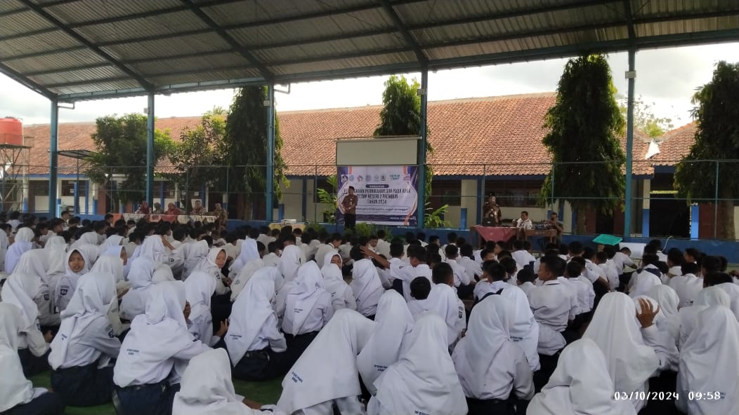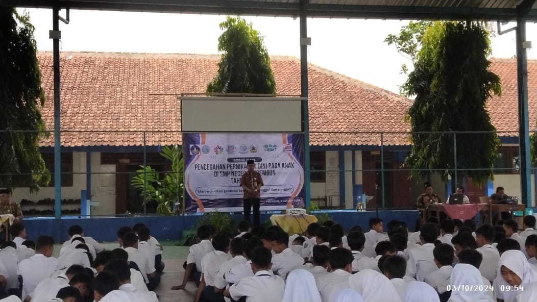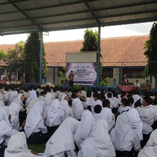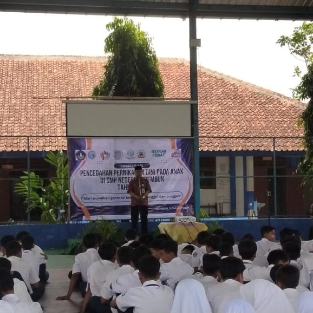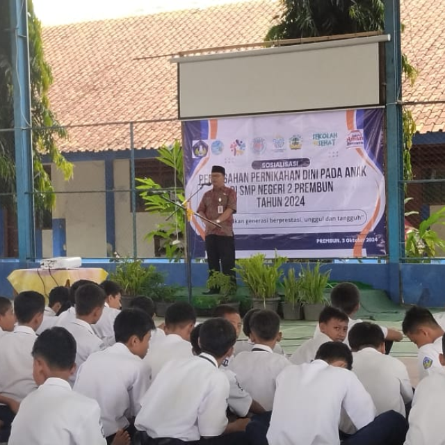 Kegiatan pencegahan pernikah dini pada anak di SMP NEGERI 2 PREMBUN dilaksanakan pada 03 Oktober 2024. Kegiatan ini dilaksanakan di GOR SMP NEGERI 2 PREMBUN dan diikuti oleh seluruh siswa-siswi SMP NEGERI 2 PREMBUN. Kegiatan ini bertujuan untuk mencegah pernikahan dini pada siswa-siswi SMP NEGERI 2 PREMBUN. Kegiatan ini disampaikan oleh pihak Puskesmas Prembun dan BKKBN Kebumen. Adapun susunan acaranya dimulai dengan menyayikan lagu Indonesia Raya, dilanjutkan sambutan dari kepala sekolah SMP NEGERI 2 PREMBUN, penampilan-penampilan dari siswa-siswi, edukasi dari BKKBN Kebumen tentang akibat pernikahan dini pada anak, dilanjutkan edukasi dari Puskesmas Prembun. Siswa-siswi mengikuti acara tersebut dengan tenang dan antusias.